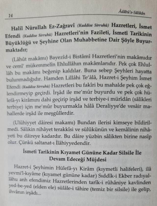Nakşibendî Müceddidî Halidî Yolunun 32. halkası Büyük Şeyh Efendi İsmet Garibullah (vefat h. 1289/ m. 1872) kuddise sırruhu’nun halifesi ve ondan sonraki postnişin Mevlâna Halil Nurullah ez-Zağravi -ya da ez-Zeğravi- (vefat h. 1311/ m. 1893) Âdâbü’s-Sâlikan (Müridlerin Edepleri ve Seyr-i Sülük) isimli eserinde şeyhi İsmet Garibullah Efendi’nin tarikatının/ yolunun/ nispetinin kıyamet gününe kadar elden ele geçerek halifeleri yoluyla devam edeceğini, buyuruyor. (Kaynak: Âdâbü’s-Sâlikan Müridlerin Edepleri ve Seyr-i Sülük, Ahıska Yayınevi: İstanbul, tarihsiz), s. 71.